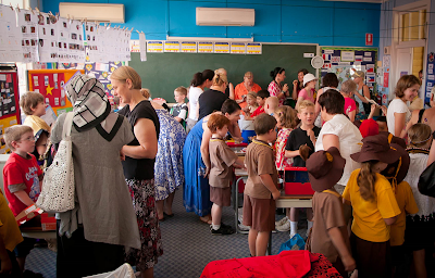 We celebrated our SOSE (study of society and environment) unit on Tuesday by holding a World Travel Expo in the last hour of the school day. Students used their desks to display their dioramas, handmade snow dome souvenirs, travel brochures posters and country reports. Some of us dressed up or wore the colours of our country's flag. We sang Frere Jacques (more than once...) and with a Ding Dang Dong, the day ended way too soon. Thanks to our parents for visiting. For those of you who wish they could have made it- here are a few photos.